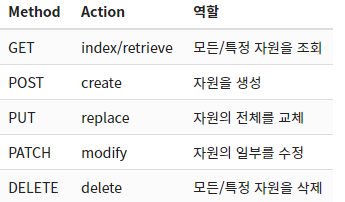 주로 5가지의 Method(GET, POST, PUT, DELETE , PATCH)를 사용해서 CRUD를 구현한다.